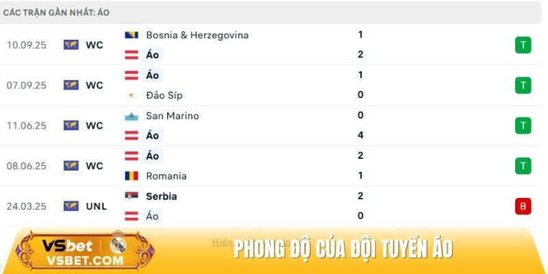 Phong độ đội khách Áo