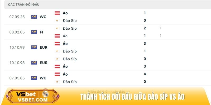 Thành tích khi Đảo Síp vs Áo chạm trán nhau