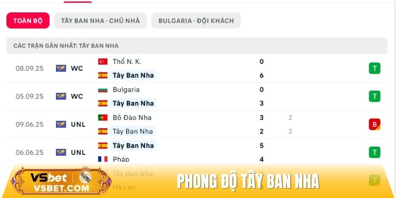 Chiến thắng 3-0 trước Bulgaria ở lượt đi không chỉ là lời khẳng định sức mạnh. Điều đó còn là minh chứng cho lối chơi pressing tầm cao và khả năng chuyển trạng thái sắc bén. Họ cầm chân Bồ Đào Nha 2-2 theo lịch thi đấu của giải Nations League hồi tháng 6. Trong 10 trận gần nhất, đội bóng xứ sở bò tót thắng 7, hòa 1 và chỉ thua 1 với trung bình 2.4 bàn thắng mỗi trận.