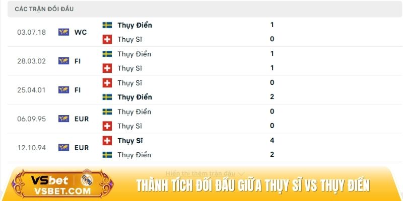Thành tích khi Thụy Sĩ vs Thụy Điển chạm trán nhau