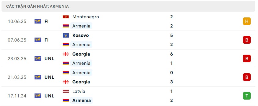 Armenia đang trải qua một giai đoạn vô cùng tăm tối với những kết quả thi đấu đáng báo động. Thống kê trong 6 trận gần nhất trên mọi đấu trường, họ chỉ giành được duy nhất một chiến thắng, hòa một và phải nhận tới bốn thất bại nặng nề. Hàng phòng ngự của đội bóng này bộc lộ quá nhiều yếu điểm, điển hình là hai trận thua tan nát trước Georgia với tỷ số 1-6 và 0-3.