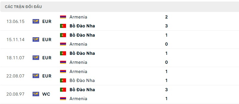 Thành tích đối đầu giữa Armenia vs Bồ Đào Nha