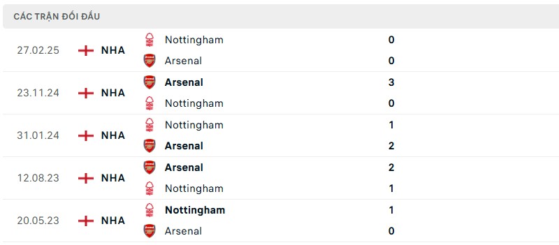 Thành tích đối đầu giữa Arsenal vs Nottingham