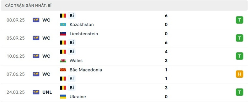 Phong độ của Bỉ vs Bắc Macedonia gần đây