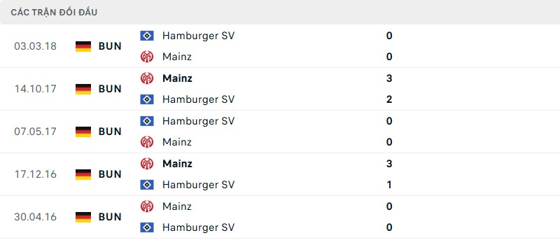 Thành tích đối đầu giữa Hamburger với Mainz
