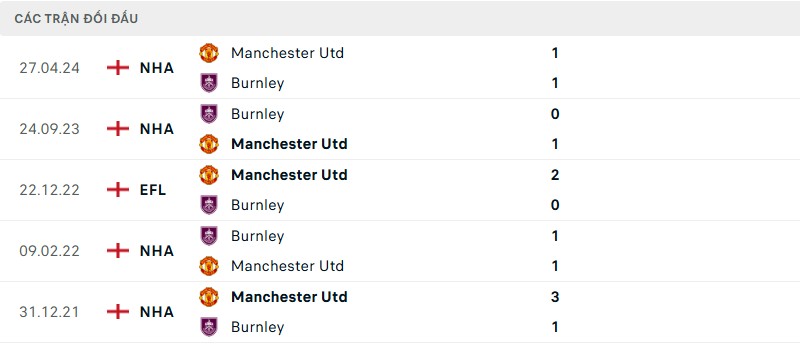 Lịch sử đối đầu hoàn toàn nghiêng về phía Man United. Quỷ Đỏ đang sở hữu chuỗi 7 trận bất bại liên tiếp trước Burnley, cho thấy sự vượt trội rõ rệt. Dù lần gần nhất tiếp đón đối thủ tại Old Trafford có kết quả hòa, đó chỉ là một cú sảy chân và họ quyết tâm giành trọn 3 điểm lần này.