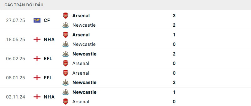 Thành tích đối đầu giữa Newcastle với Arsenal