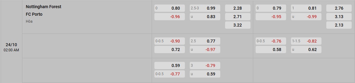 Với phong độ trái ngược, Porto được xếp cửa trên với kèo chấp -1 là điều dễ hiểu. Họ là lựa chọn đáng tin cậy khi thắng kèo 8/10 trận gần nhất, cùng thành tích sân khách toàn thắng. Ngược lại, Nottingham Forest thua kèo 4/6 trận gần đây và thi đấu tệ trên sân nhà.