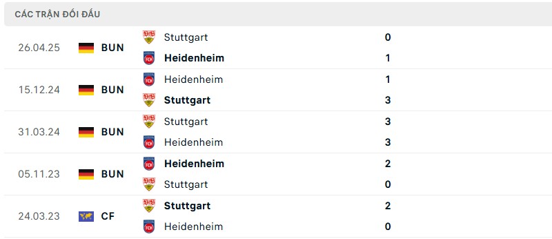 Thành tích đối đầu giữa Stuttgart vs Heidenheim