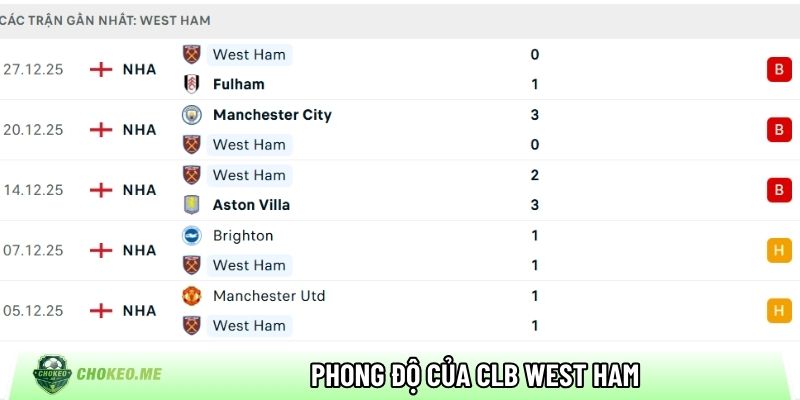 Chuỗi phong độ gần đây của West Ham khá đáng thất vọng khi họ không thắng trong 6 trận liên tiếp. Đáng chú ý, hàng thủ của đội bóng này đã để thủng lưới trong cả 6 trận gần nhất, tổng cộng nhận 11 bàn thua. Việc không giữ sạch lưới trận nào cho thấy hệ thống phòng ngự của West Ham đang gặp vấn đề nghiêm trọng, đặc biệt trong khâu chống phản công và phòng ngự cuối trận.