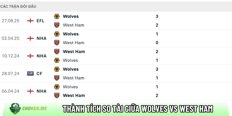 Soi kèo Wolves vs West Ham về lịch sử đối đầu, hai đội đang cho thấy sự cân bằng đáng kể trong những lần chạm trán gần đây. Kể từ tháng 1 năm 2023, Wolves và West Ham đã gặp nhau 6 lần, trong đó mỗi đội có 3 chiến thắng và không có trận nào kết thúc với tỷ số hòa. Tổng cộng 16 bàn thắng đã được ghi trong giai đoạn này, trung bình mỗi trận có khoảng 2,67 bàn thắng.